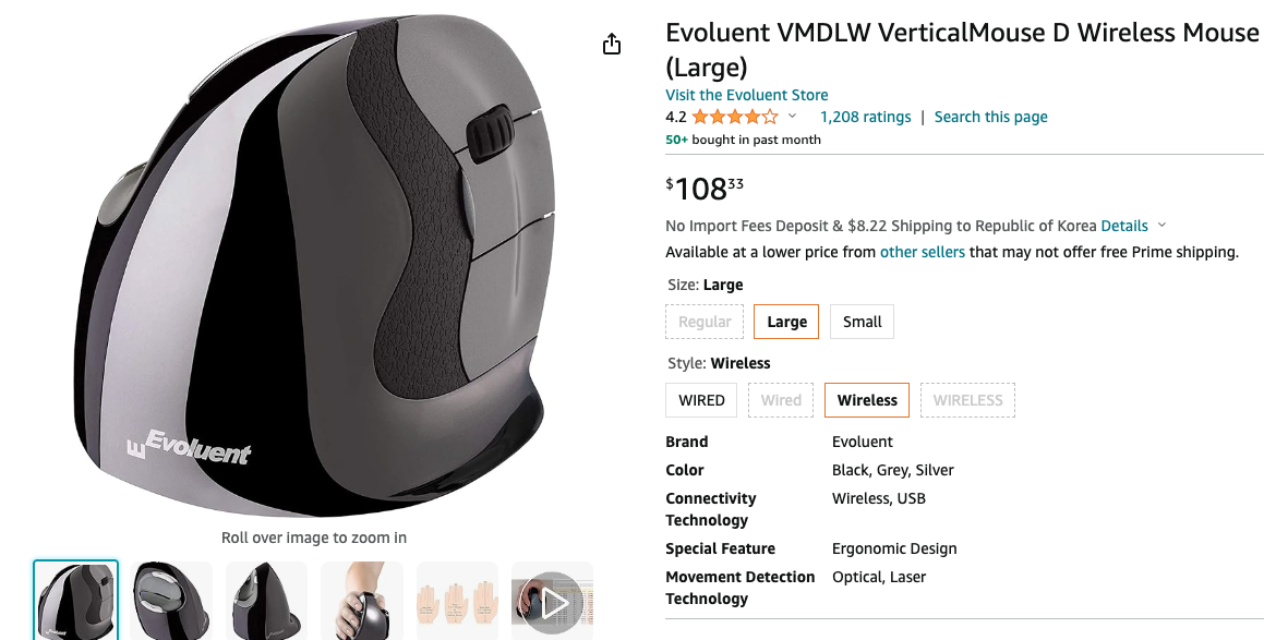 마지막으로 최초의 버티컬 마우스를 만든 회사의 제품인 에볼루엔트(Evoluent)의 VerticalMouse D입니다. 이 마우스의 독특한 특징은 일반적인 버티컬마우스는 손날이 바닥에 쓸리는 데, 그것을 방지하기 위해 바닥 쪽을 넓게 만들어 손날을 받쳐줍니다. VerticalMouse D는 에볼루엔트 마우스 드라이버를 통해 조정 가능한 레이저 센서 컨트롤을 제공하므로 사용자는 마우스의 반응성을 미세 조정할 수 있습니다. 버티컬 마우스만 생산하는 회사로 인체공학적 측면과 편안함 측면에서는 타의 추종을 불허합니다.