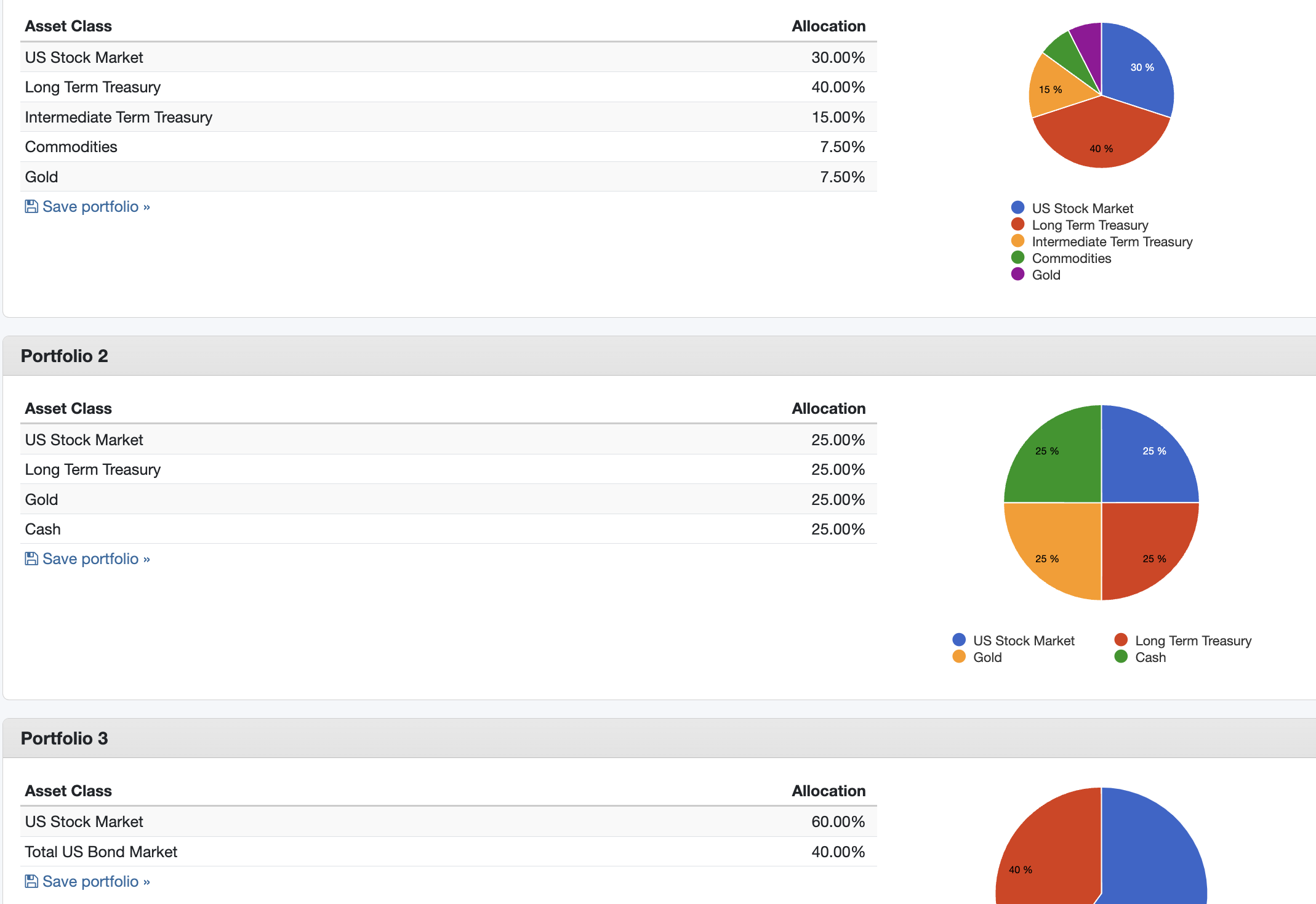 저는 웹사이트에서 기본 제공되는 포트폴리오들을 사용하여 성과를 비교해보았습니다. 제가 비교한 3가지 포트폴리오는 올웨더 포트폴리오(Ray Dalio All Seasons), 영구 포트폴리오(Harry Browne Permanent Portfolio) 그리고 주식60%/채권40%(Stocks/Bonds(60/40))입니다. (올웨더, 영구 포트폴리오에 대한 설명은 포스팅 맨 아래에 따로 적어두었습니다.)