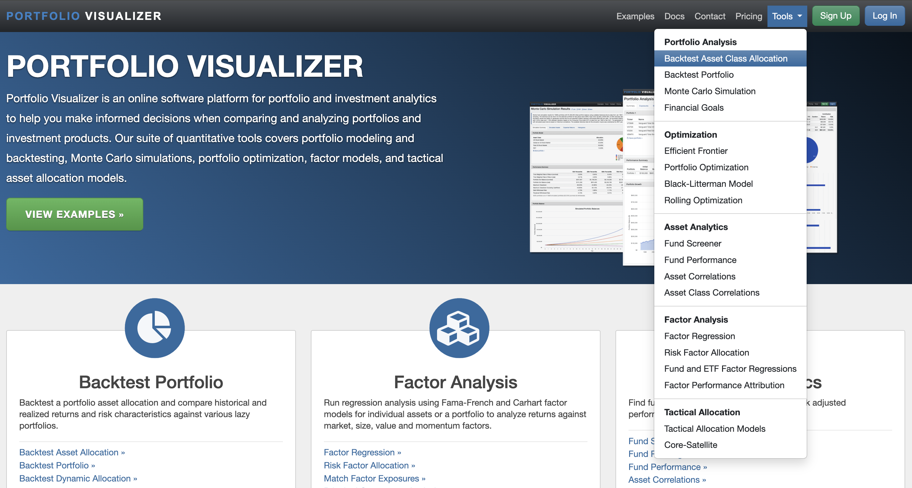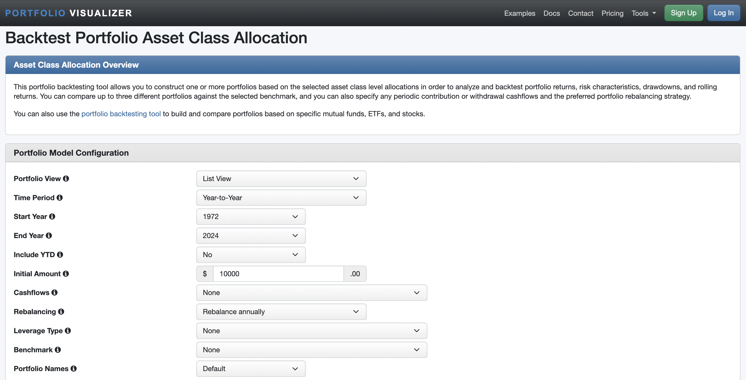 포트폴리오 비주얼라이저(https://www.portfoliovisualizer.com/)에 접속하여 우측 상단의 Tools를 클릭한 후 'Backtest Asset Class Allocation'을 클릭하면 포트폴리오의 자산유형을 구성해볼 수 있는 화면이 나옵니다.(만약 실제 미국 주식으로 백테스트를 해보고 싶다면 그 아래 'Backtest Portfolio'에서 Ticker symbol을 입력하여 포트폴리오 성과를 확인할 수 있습니다.)