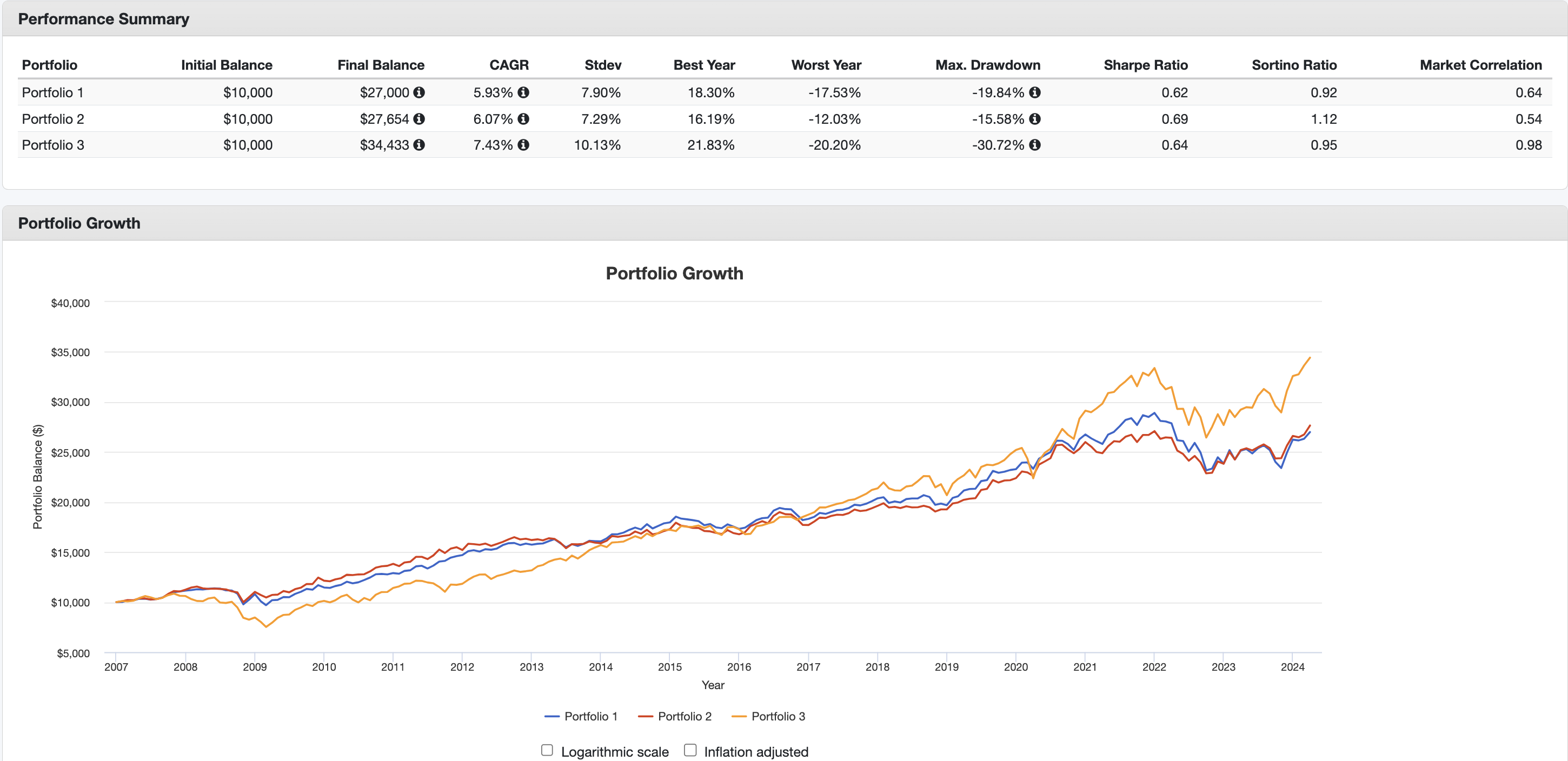 비교 결과에서 주목해야할 점이 있는데요. Portfolio 2번에 해당하는 영구포트폴리오가 Portfolio 1번인 올웨더 포트폴리오보다 연평균성장률(CAGR)은 더 크고, 최대 하락폭은 더 작았다는 것입니다. 일반적으로 더 많은 수익을 얻으려면 더 리스크가 커야하는데, 영구포트폴리오는 올웨더 포트폴리오보다 수익은 더 크고, 리스크는 더 적은 모습을 보였습니다. 이런 상황이 가능한 게 포트폴리오 구성의 묘미라고 생각합니다. 이 결과만으로 올웨더가 영구 포트폴리오보다 항상 좋다고는 할 수 없습니다. 백테스트 기간을 2007년~2024년초가 아닌 다른 기간을 활용한다거나 리밸런싱 주기를 변경하는 등 조건을 변경하면 다른 결과가 나올 수 있기 때문이죠.